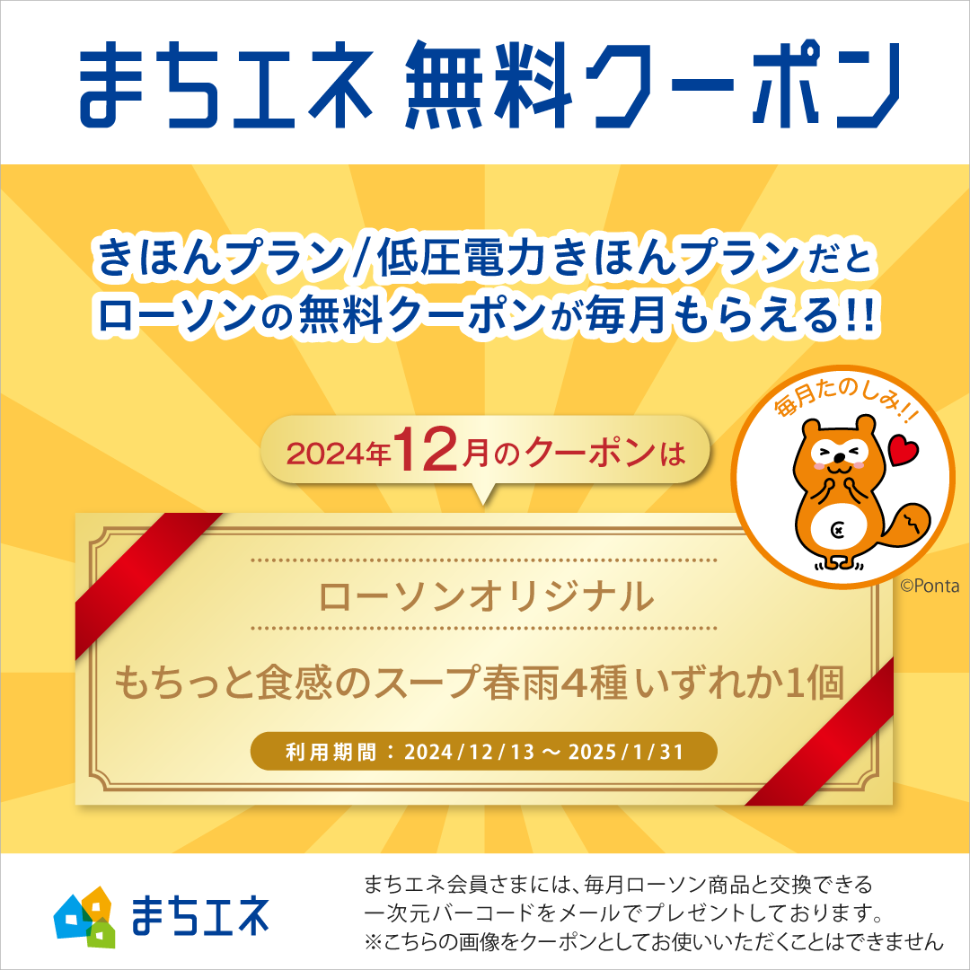 まちエネ「きほんプラン」「低圧電力きほんプラン」ご契約者さまには、毎月ローソン商品と交換できる一次元バーコードを、メールでプレゼントしております。