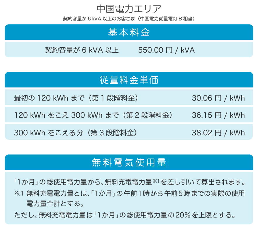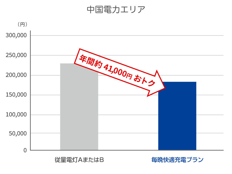 ・中国電力株式会社の従量電灯AまたはBメニューと当社毎晩快適充電プランとの比較
